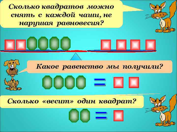 Сколько квадратов можно снять с каждой чаши, не нарушая равновесия? Какое равенство мы получили? Сколько «весит» один квадрат?