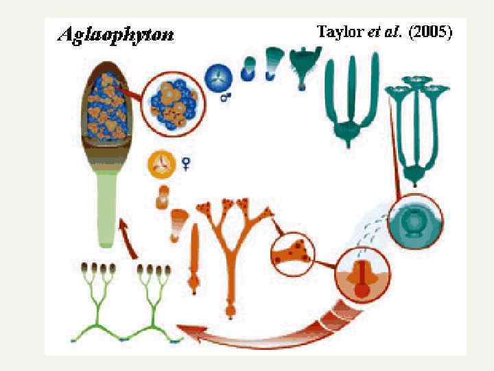 Horneophyton – Хорнеофитон Возможный предок моховидных (имеет колонку в спорангии), в клубневидных ризомоидах – гифы гриба-симбионта (Paleomyces) Время жизни – нижний девон Высота – около 0, 5