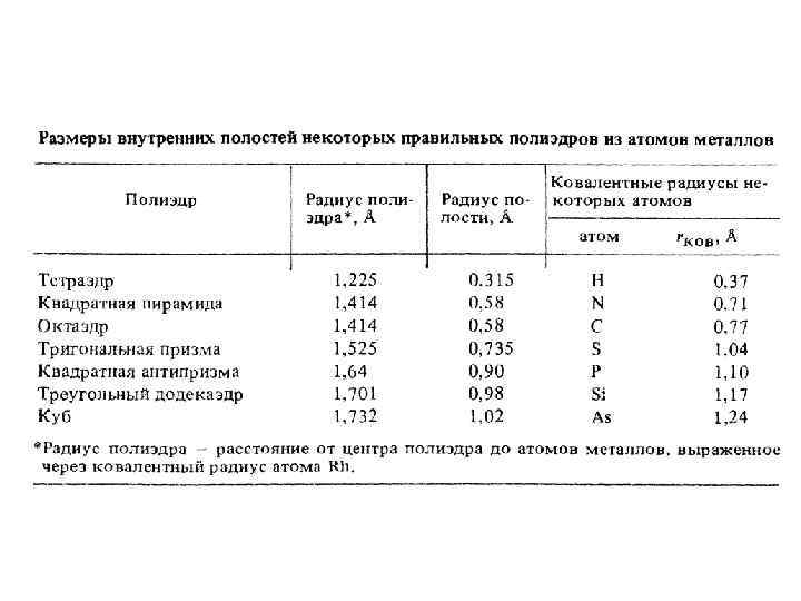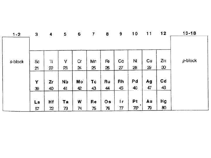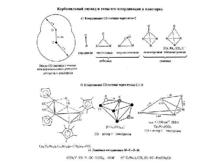 Число электронов, поставляемых лигандами атомам металла в комплексах, когда атомы металла рассматриваются незаряженными Лиганд Тип координации Число донируемых электронов H 1 1 NR 3 1 2 H 2 1 NCR 1 2 H 3 1 NO 1 3 CO 1 2 PR 3 1 2 CO 2 2 OR 1 1 CS 1 2 OR 2 3 CR 2 1 2 OR 2 1 2 η 2 -C 2 R 4 1 2 O, S, Se, Te 1 2 η 2 -C 2 R 2 1 2 O, S, Se, Te 2 2 η 5 -C 5 R 5 1 5 O, S, Se, Te 3 4 η 6 -C 6 R 6 1 6 F, Cl, Br, I 1 1 Si. R 3 1 2 F, Cl, Br, I 2 3 C int 4 F, Cl, Br, I 3 5 N, P int 5 CH 1 3 O, S int 6 CN 1 1 1 – терминальный лиганд; 2 – мостик между 2 атомами металла; 3 – мостик между 3 атомами металла; int – атом, внедренный внутрь металлического кластера