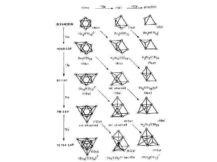 Closo – кластеры по своим электронным свойствам подразделяются на несколько групп: 1. Электроноточные кластеры, в которых каждое ребро полиэдра Мn представляет собой двухэлектронную двухцентровую металл-металл связь (2 е 2 с). 2. Электронодефицитные кластеры, в которых реализуются двухэлектронные трехцентровые металл-металл связи типа 2 е 3 с (связь трех атомов металла в треугольных гранях полиэдров Мn). 3. Кластеры, подчиняющиеся правилу Уэйда (K. Wade, Electron deficient compounds, L. , Nelson, 1971), предложенному для полиэдрических гидридов бора и карборанов. Позднее это правило было уточнено Д. Мингосом (Mingos D. M. P. , Wales D. J. , Introduction to cluster chemistry, 1980) и Дж. Лойером (Lauher J. W. , JACS, 1978, v. 100, p. 5305) и перенесено на крупные металлокластерные соединения. 4. Другие кластеры, не входящие в выше приведенные группы.