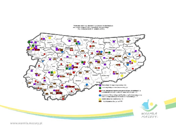 Dobre praktyki • Ważnym dla rozwoju ekonomii społecznej jest aby samorządy województwa warmińsko – mazurskiego stosowały klauzule społeczne zarówno w zamówieniach publicznych jak i zamówieniach podprogowych, w których zamawiający nie musi stosować Prawa zamówień publicznych (obecnie są to zamówienia o wartości poniżej 30 tysięcy euro).