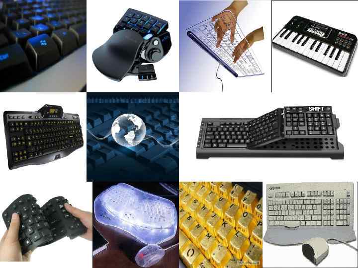 Виды клавиатур: Кроме стандартных клавиатур есть и другие, которые отличаются дизайном, количеством клавиш, материалом изготовления. Эргономичные Мультимедийные Мобильные Игровые Дизайнерские Лазерные Гибкие Проецируемые виртуальные клавиатуры Клавиатура для слабовидящих Клавиатура с крупным шрифтом
