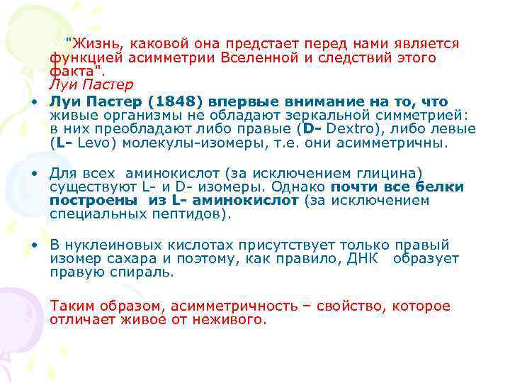 "Жизнь, каковой она предстает перед нами является функцией асимметрии Вселенной и следствий этого факта". Луи Пастер • Луи Пастер (1848) впервые внимание на то, что живые организмы не обладают зеркальной симметрией: в них преобладают либо правые (D- Dextro), либо левые (L- Levo) молекулы изомеры, т. е. они асимметричны. • Для всех аминокислот (за исключением глицина) существуют L и D изомеры. Однако почти все белки построены из L- аминокислот (за исключением специальных пептидов). • В нуклеиновых кислотах присутствует только правый изомер сахара и поэтому, как правило, ДНК образует правую спираль. Таким образом, асимметричность – свойство, которое отличает живое от неживого.