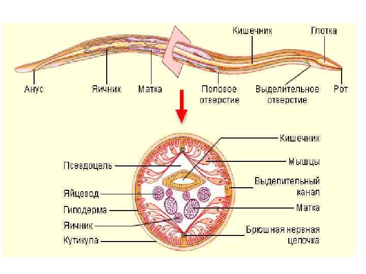 Поперечный срез самки аскариды Ascaris lumbricoides Поперечный срез тела аскариды имеет округлую форму. Стенка тела образована кожно мускульным мешком. Он состоит из трех слоев: кутикулы, гиподермы и продольных мышц. Толстая трехслойная кутикула распо ложена снаружи и имеет четкие очертания. Под кутикулой виден тонкий слой гиподермы. Гиподерма — это эпителиальный слой кожи, потерявший клеточное строение и представляющий собой цитоплазматическую массу с включенными в нее ядрами. Гиподерма образует утолщения, направленные внутрь тела, валики: спинной, брюшной и два боковых. Боковые валики гиподермы имеют вид низких трапециевидных выростов. В центре боковых валиков видны щелевидные просветы — поперечные разрезы вы делительных каналов. Спинной и брюшной валики имеют вид бокаловид ных выростов. В спинном и брюшном валиках видны овальные образова ния—поперечные разрезы спинного и брюшного нервных стволов. Под гиподермой расположен слой продольных лентовидных мышц, разделенных валиками гиподермы на четыре группы мышечных волокон. В поперечном разрезе эти волокна имеют вытянутую форму и своеобразное строение. Центральные части мышечных волокон на брюшной стороне тела наклонены к брюшному валику гиподермы, на спинной — к спинному. Периферические участки мышечных волокон прилегают к гиподерме. Они содержат миофибриллы и имеют вид ворсинок. В средней части препарата виден кишечник с толстой стенкой, образо ванной ысокими эпителиальными клетками. в Они создают впечатление поперечной исчерченности стенки кишечника. Обычно кишечник не со храняет круглую о форму, а приобретает неправильные контуры. Между стенкой кишечника и гиподермой расположена первичная по лость тела – бластоцель. В ней видны дискообразные срезы трубчатых органов женской половой системы: яичников, яйцеводов и матки. Несколько перечных срезов трубчатого извитого яичника расположены около кишки и имеют небольшой диаметр. Незрелые яйцевые клетки яичника имеют клиновидную форму, и границы между ними образуют фигуру, похожую на спицы в колесе, расположенные почти вплотную друг к другу. Яйцеводы имеют больший диаметр и тонкую стенку. Внутри яйцеводов видны незрелые яйцеклетки, лишенные оболочки. Наибольший диаметр имеют срезы трубчатой матки. Она имеет толстые стенки, а в ее полости видны многочисленные зрелые оплодотворенные яйцеклетки с толстыми оболочками.