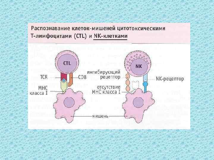 Ш Рецептор NK-клеток, предназначенный для распознавания клеток-мишеней, представляет собой белок, распознающий углеводные остатки при участии ионов кальция (С-лектин) NKRP 1 (CD 161). Он распознаёт концевые остатки маннозы на молекулах мембранных гликопротеинов и гликолипидов. Ш норме они блокированы остатками сиаловой кислоты, В отсутствующими у юных и старых клеток, а также пролиферирующих и трансформированных клеток. Ш Однако, мишенями NK-клеток могут быть лишь клетки, на поверхности которых присутствуют гликоконъюгаты со свободными оститками маннозы и не содержащие молекулы МНС I.