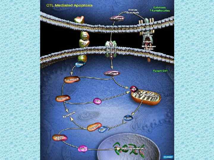 TNFR-1 CD 4+ и CD 8+ клетки инициируют клеточную гибель, экспрессируя лиганд Fas (Fas. L). Он распознаёт поверхностный белок Fas на клетках-мишенях; далее происходит образование тримеров Fas и ассоциация молекул FADD доменами гибели. В результате запускается каскад активаций различных каспаз, что приводит к апоптозу. Не только Fas может приводить к гибели. Связывание молекул TNFR-1 с адаптерными белками RIP или TRADD также активирует некоторые каспазы. Эти механизмы зависят от наличия ионов кальция; однако, при отсутствии последних, они не блокируются полностью.
