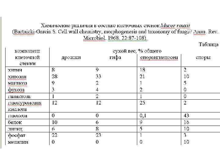 Различия в химическом составе полисахаридов у разных таксонов -клеточные стенки традиционно известных Zygomycota содержат хитин и хитозан (полимер глюкозамина образующегося из хитина путем удаления N-ацетильных групп) среди более волокнистых полимеров и полиглюкуроновая кислота и глюкурономаннобелки среди водно-растворимых гельподобных полимеров. -Ascomycota и Basidiomycota оба содержат хитин вместе с β 1, 3, β 1, 6 связанных глюканов в фибриллярной форме, но Ascomycota содержат гелеподобный α 1, 3 глюкан и галактоманнопротеины, у Basidiomycota ксиломаннопротеины обнаружены поблизости от α 1, 3 глюкана (Gooday, 1995 a, Bowman and Free, 2006).