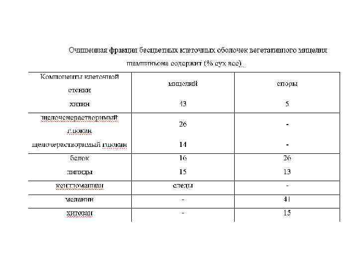 Содержание хитина у разных грибов 1 -2% хитина от сухого веса КС дрожжи 10 – 20 % от сухого веса КС Aspergillus Neurospora