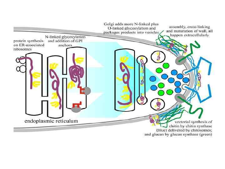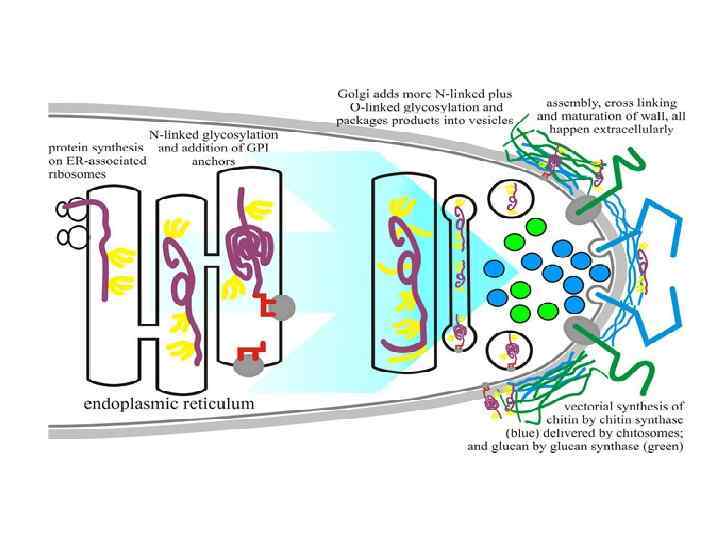 заключение Компоненты КС глюкан и хитин синтезируются векторно на цитоплазматической мембране и выдавливаются в пространство снаружи от плазмалеммы в процессе их синтеза. Гликопротеины стенки проходят через секреторные пути эндоплазматический ретикулум. Гольджи и секретируются в то же самое пространство стенки, где они интегрируются в структуру КС. Разные компоненты КС связываются поперечно на месте при участии ассоциированными с КС гликозилгидролазами и гликозилтрансферазами