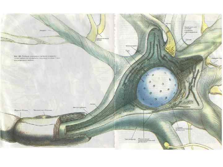 Особенности микроструктуры нейрона Ядро – всегда в интерфазе Субстанция Ниссля (тигроид) Митохондрии – большое количество, способны к перемещению внутри клетки АГ + лизосомы – хорошо выражены Хорошо развитая сеть микротрубочек (диаметр 20 -26 нм), нейрофиламентов (8 -10 нм) и микрофиламентов (6 -8 нм); специфические для нейрона белки