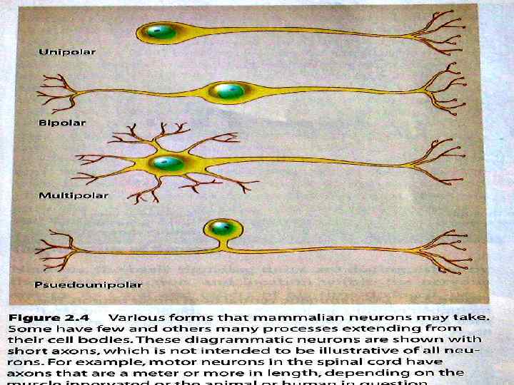 У типичного нейрона 1. Аксон один, а дендритов несколько. 2. Дендрит короче аксона. Длина дендрита обычно не более 700 мкм, а аксон может достигать длины 1 м. 3. Дендрит плавно отходит от тела нейрона и постепенно истончается. Аксон, отходя от тела клетки, практически не меняет диаметр на всем своем протяжении. Диаметр различных аксонов колеблется от 0, 3 до 16 мкм. 4. Дендриты ветвятся на всем своем протяжении под острым углом, дихотомически (вильчато), ветвление начинается от тела клетки. Аксон обычно ветвится только на конце, образуя контакты (синапсы) с другими клетками. 5. Дендриты (по крайней мере, в ЦНС) не имеют миелиновой оболочки, аксоны часто окружены миелиновой оболочкой. 6. Проксимальные части Д. содержат нисслевскую зернистость. А. не имеют тигроида.