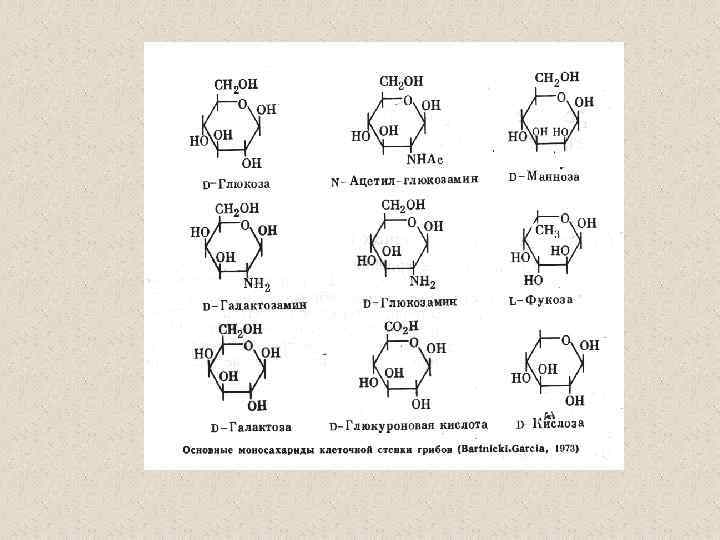 Компоненты КС (90% полисахариды) Три главные группы: глюканы, маннаны и хитин Два главных типа компонентов КС различаются по функциям: • структурный компонент, который определяет жесткость КС • компоненты матрикса – связующий материал между фибриллами различия по структуре структурные компоненты (щелоченерастворимы) • хитин (полимеры β-1, 4 -связанных остатков N-ацетилглюкозамин); и хитозан (деацетилированный хитин) • глюкан – полимеры β-1, 3 -связанных остатков глюкозы с короткими β-1, 6 связанными боковыми веточками • целлюлоза - β-1, 4 -связанные глюканы (очень редко) матриксные компоненты (растворимы в щелочи) • глюкуроновые кислоты и др. • маннопротеины (манноза связанная с белком), галактоманнопротеины и др.