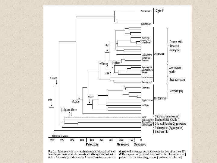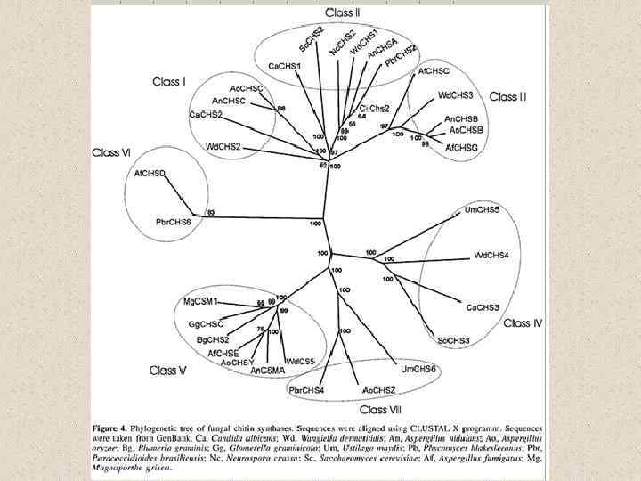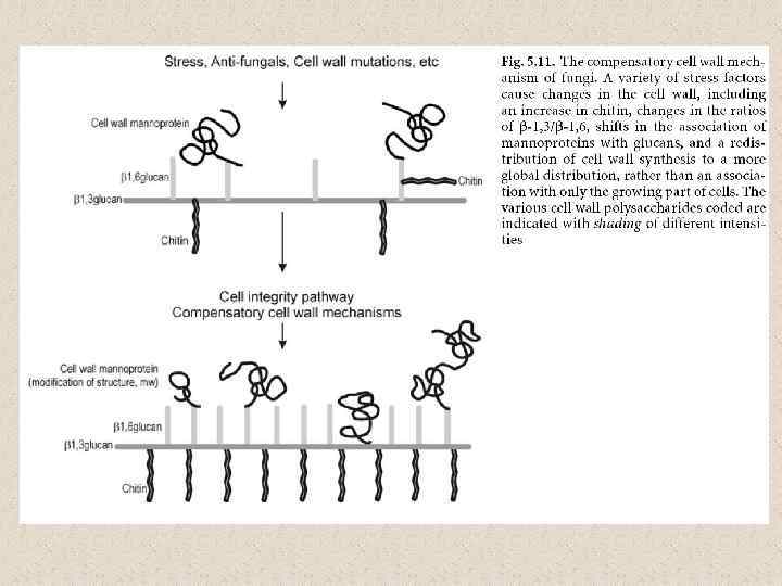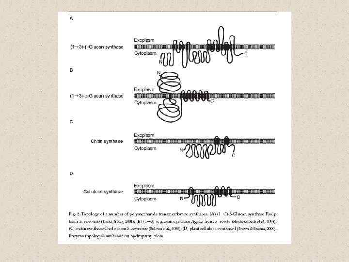 Молекулярная организация клеточной стенки у разных грибов (Howard and Gow, 2007) хитин α-1, 3 глюкан β-1, 3 -глюкан β-1, 4 глюкан β-1, 6 -глюкан гликопротеины и белки клеточной стенки (CWP) Saccharomyces cerevisiae + - + _ + маннопротеины Schizosaccharomyces pombe - + + _ + галактоманнопротеины Candida albicans + - + _ + Exophiala dermatitidis + _ + + + _ + маннопротеины с β 1, 2 -связями галактоманнопротеины, рамноманнан адгезивный белок (фактор вирулентности), галактоманнопроте инов мало Penicillium marneffei + - + + Fusarium oxysporum + + + - + маннопротеины + + + - + Neurospora crassa + ? + - - Ustilago maydis + - ? + + + - - + Sporothrix schenckii Blastomyces dermatitidis Aspergillus spp. Trichosporon cutaneum Crypyococcus neoformans галактоманнанопро теины, галактозоаминоман наны галактозоаминопро теины ксилломаннанопрот еины глюкуроноксилома ннан, маннопротены капсула: глюкуроноксилома ннаны и α-1, 6 галактан