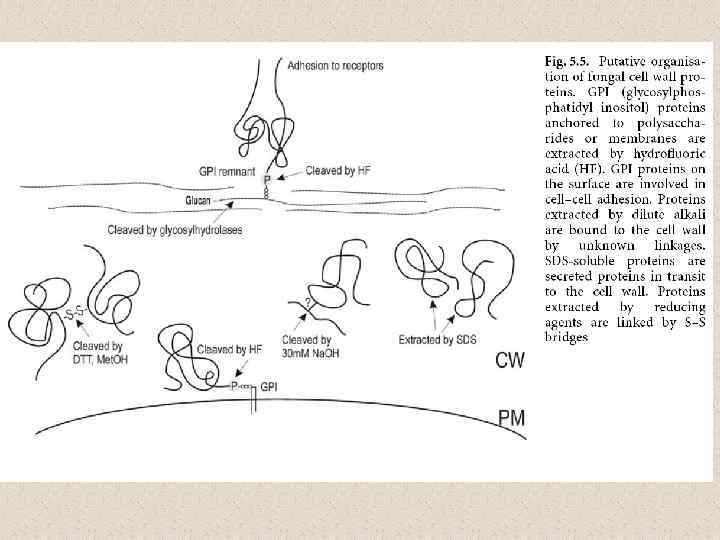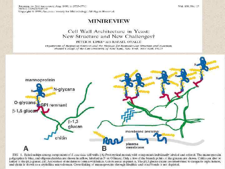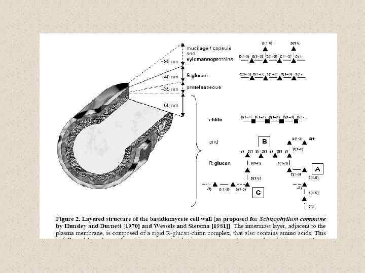 The structure and synthesis of the fungal cell wall Representation of the fungal cell Shaun M. Bowman and Stephen J. Free, 2008 wall. The major components of the fungal cell wall arechitin, glucans and glycoproteins. Although species-specific variations exist, the cell wall components are thought to be arranged as shown. Most ofthe chitin is considered to be located near to the plasma membrane. The beta-1, 3 glucan extends throughout the cell wall. The glycoproteins are extensively modified with N- and O -linked oligosaccharides. Many of the glycoproteins have GPI anchors (гликозилинозитолфосфатидил), which tether them to the plasma membrane while other glycoproteins are secreted into the cellwall space. The proteins, glucans and chitin components are integrated into the wall by crosslinking the chitin, glucans, protein-associated oligosaccharides and GPI anchors together.