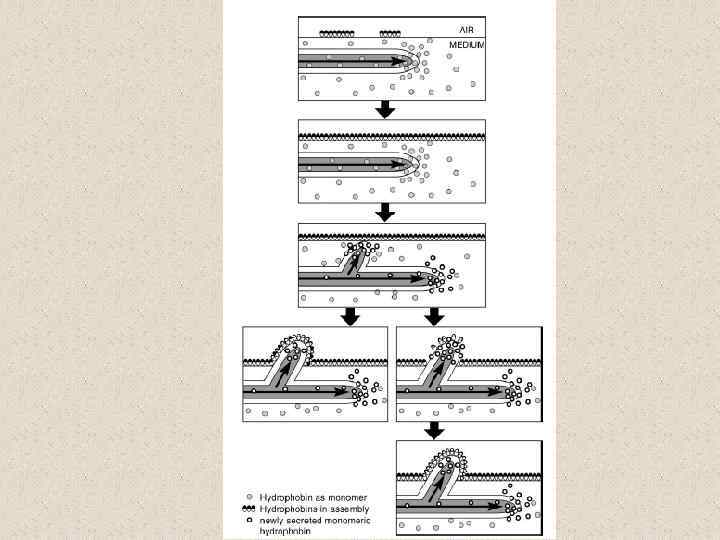 • • • Гидрофобины – большая неоднородная группа родственных белков широко распространенных у мицелиальных грибов. Они образуются грибами в процессе их жизнедеятельности и могут составлять до 10% от общего белка стенки. Каждая молекула состоит из гидрофобного домена и гидрофильного домена. Амфипатичная структура обеспечивает экстраординарные функции в процессе роста и развития как элиситоры и токсины. Белки экскретируются на кончике гифы. Если гифа находится в водной среде, гидрофобины переходят в раствор. Если гифа выходит из раствора наружу, полипептид полимераза располагается параллельно поверхности гифы. Протеин оказывается повернутым к клеточной стенке гидрофильным концом, а гидрофобный конец направлен наружу. Такая структура снижает движение воды через клеточную стенку гифы, обеспечивая защиту от высыхания. А также увеличивает прочность стенки. Гидрофобный домен обеспечивает взаимодействие с гидрофобными поверхностями. Этими поверхностями могут быть другие гифы, что приводит к образованию структурного комплекса (плодовое тело). Гифы могут также взаимодействовать с гидрофобными поверхностями растений, способствовать взаимодействию спор перед формированием аппресориев. Гидрофобины выполняют важную роль в морфогенезе грибов. Показано, что гидрофобиновый домен у грибов – микобионтов лишайников контролирует движение воды по таллому. Домены обеспечивают защиту logging воды в воздушном пространстве, позволяет перемещение воды и питательных веществ по каналам, контролируемым грибом. Это позволяет предположить механизм регуляции извлечения (output) фотобионта that is essentially mechanistic. Каждый гриб имеет более одного гена и более 10 разных гидрофобинов. Разные гены гидрофобинов экспрессируются в разное время. У Schizophyllum белок, обнаруженный в стенках гифы отличается от белка, экспрессируется в трубочках (tubes) базидиокарпа. Гены экспрессируются по-разному у монокарионов и дикарионов одного и того же гриба. Регуляция экспрессии является частью комплекса регуляторных процессов, которые еще не достаточно изучены. Гидрофобины участвуют в широком спектре процессов. Особенно, где гифа контактирует с другими поверхностями, модификация движения растворов через стенку or require strength и ригидность мы можем обнаружить присутствие гидрофобинов.