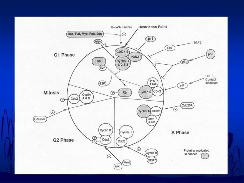 Циклины регулируют активность CDK. Если образно сравнить CDK с мотором, то циклин - это "сцепление", которое определяет, станет ли "мотор" продвигать клеточный цикл от одной фазы к другой или же будет работать на "холостом ходу". РЕГУЛЯЦИЯ КЛЕТОЧНОГО ЦИКЛА Каждая циклин-зависимая киназа (Cdk) представляет собой каталитическую субъединицу ферментного комплекса, для активности которой необходимо присутствие соответствующей активаторной субъединицы - циклина. В активной форме комплексы циклин-Cdk фосфорилируют регуляторные белки, контролирующие протекание данной фазы клеточного цикла. Уровень различных циклинов в клетке направленно изменяется, и таким образом обеспечивается продвижение по клеточному циклу. осуществляется позитивно циклинами и Cdk и негативно ингибиторами CycB/CDK1 A