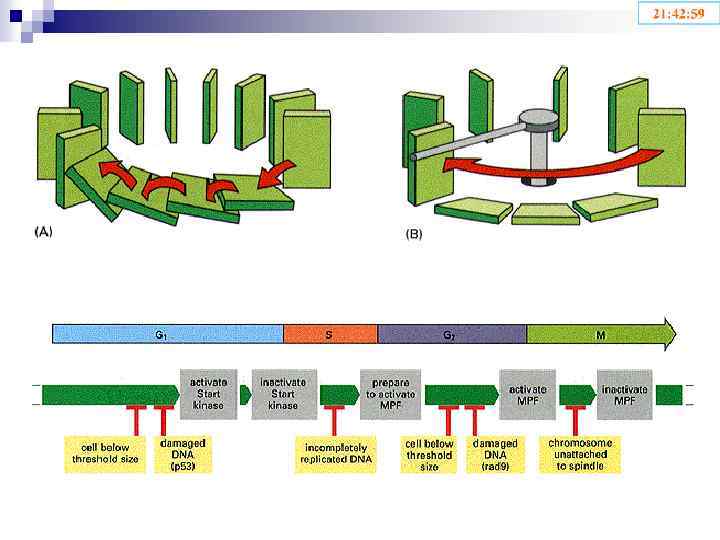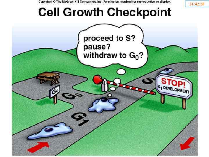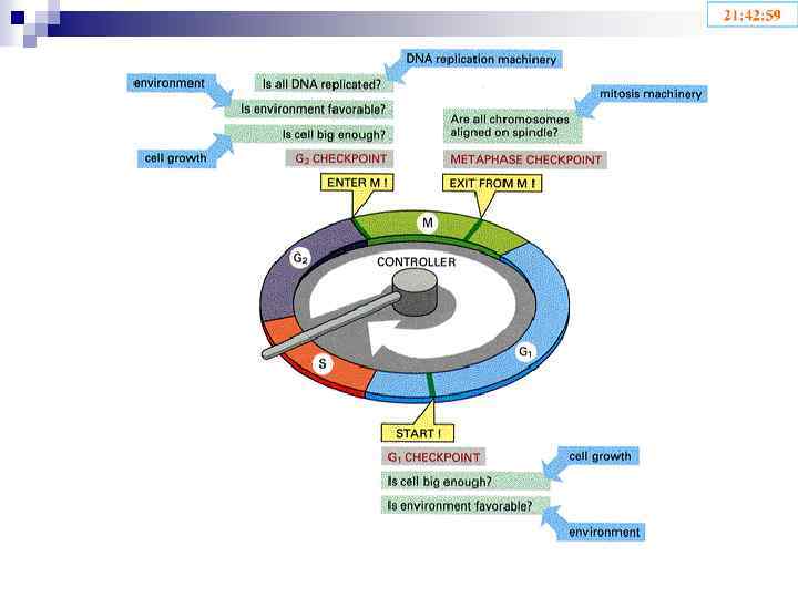 Точки рестрикции: R 1 – G 1 / S R 2 – G 2 / Митоз Точки проверки: I – G 1 (проверка клеточного роста, факторов среды) II – G 2/Митоз (проверка клеточного роста, факторов среды, качества репликации) III – Метафаза (проверка правильности прикрепления веретена деления).