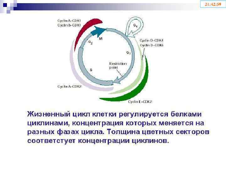 Циклины – белки, контролирующие клеточный цикл: 1. Контролируют разрушение комплексов предыдущего этапа 2. Обеспечивает протекание настоящего этапа; 3. Активирует комплекс следующего этапа сdk 2 -циклин Е сdk 2 -циклин D 1, D 2, D 3 Точка рестрикции сdk 2 -циклин A сdk 1 -циклин B