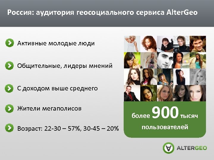Россия: аудитория геосоциального сервиса Alter. Geo Активные молодые люди Общительные, лидеры мнений С доходом выше среднего Жители мегаполисов Возраст: 22 -30 – 57%, 30 -45 – 20% более 900 тысяч пользователей