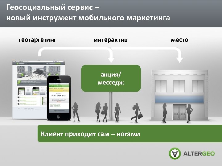 Геосоциальный сервис – новый инструмент мобильного маркетинга геотаргетинг интерактив акция/ месседж Клиент приходит сам – ногами место