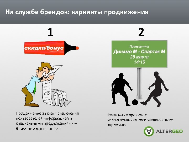 На службе брендов: варианты продвижения 1 Продвижение за счет привлечения пользователей информацией и специальными предложениями – бесплатно для партнера 2 Рекламные проекты с использованием геоповеденческого таргетинга