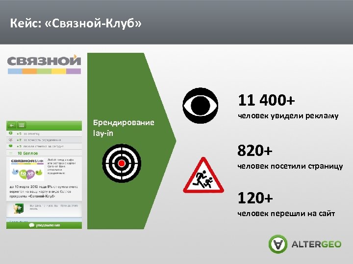 Кейс: «Связной-Клуб» 11 400+ Брендирование lay-in человек увидели рекламу 820+ человек посетили страницу 120+ человек перешли на сайт
