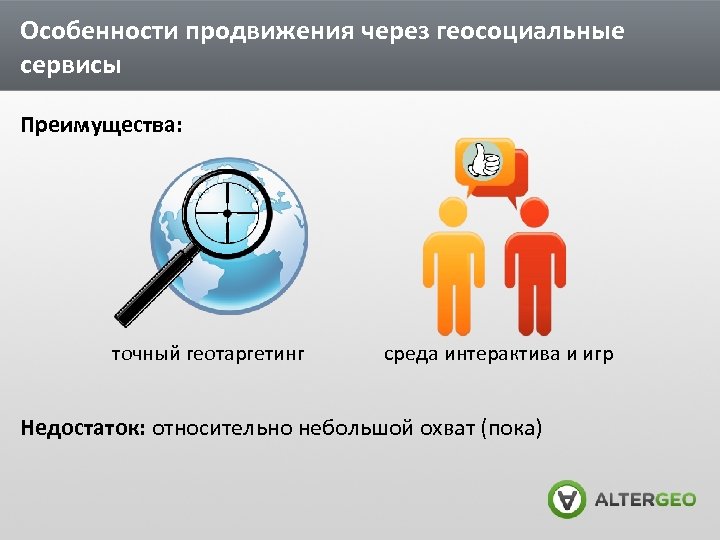 Особенности продвижения через геосоциальные сервисы Преимущества: точный геотаргетинг среда интерактива и игр Недостаток: относительно небольшой охват (пока)