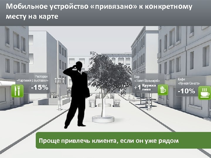 Мобильное устройство «привязано» к конкретному месту на карте Проще привлечь клиента, если он уже рядом