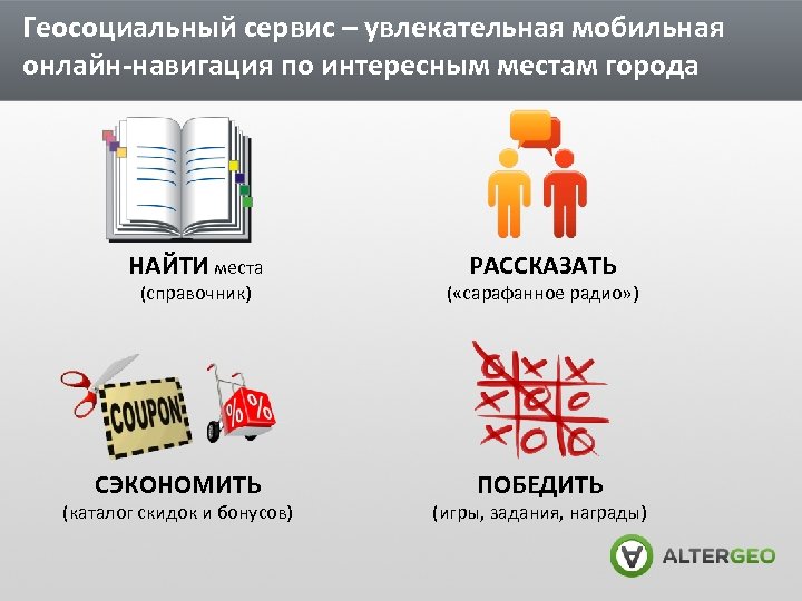 Геосоциальный сервис – увлекательная мобильная онлайн-навигация по интересным местам города НАЙТИ места (справочник) СЭКОНОМИТЬ (каталог скидок и бонусов) РАССКАЗАТЬ ( «сарафанное радио» ) ПОБЕДИТЬ (игры, задания, награды)
