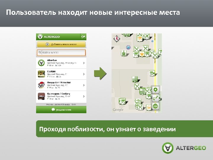 Пользователь находит новые интересные места Проходя поблизости, он узнает о заведении