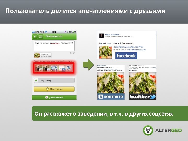 Пользователь делится впечатлениями с друзьями Он расскажет о заведении, в т. ч. в других соцсетях