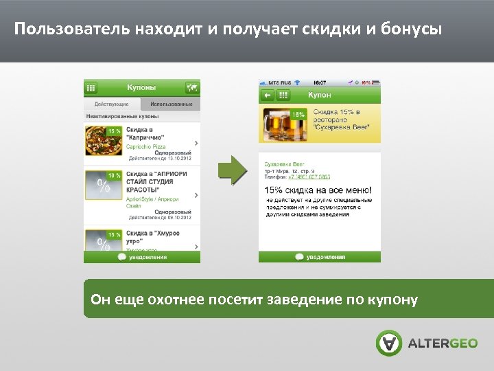 Пользователь находит и получает скидки и бонусы Он еще охотнее посетит заведение по купону