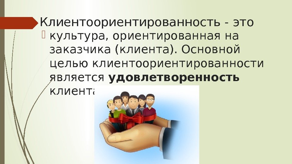 Клиентоориентированность — это культура, ориентированная на заказчика (клиента). Основной целью клиентоориентированности является удовлетворенность клиента