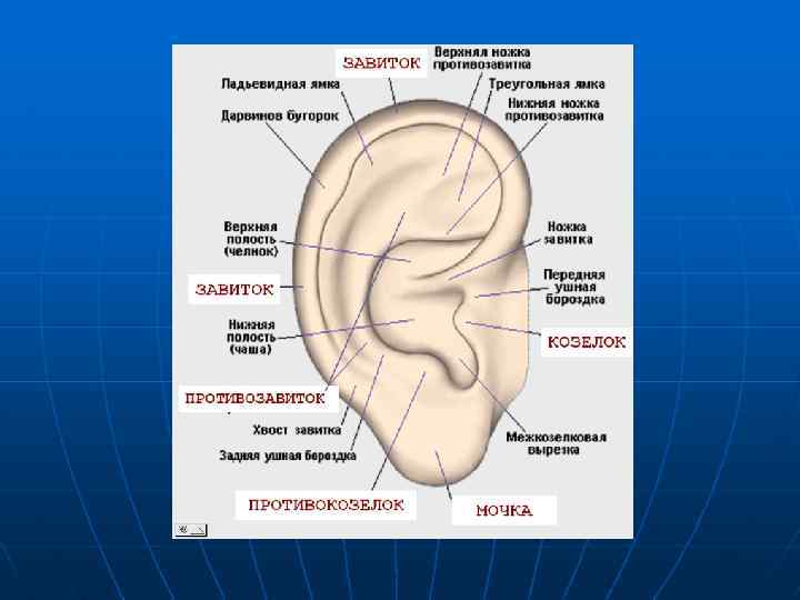 Особенности клинической анатомии наружного и среднего уха детей грудного возраста n n n n Ушная раковина мягкая, рельеф слабо выражен, завиток и мочка не отчетливые. Отсутствует костный отдел наружного слухового прохода. Вход в слуховой проход щелевидный, верхняя стенка почти вплотную прилегает к нижней. Барабанная перепонка располагается более горизонтально. Она толще, краснеет при крике. К моменту рождения у ребенка имеется только пещера, сосцевидный отросток отсутствует, он формируется к 2 -3 годам жизни ребенка. Барабанная полость и антрум представляют собой узкие щели, выполненные эмбриональной миксоидной тканью. На крыше барабанной полости имеется незаращеная щель (sutura petro-squamosa), где слизистая оболочка барабанной полости контактирует с твердой мозговой оболочкой. Слуховая труба короче, шире, глоточное отверстие расположено на уровне твердого неба.