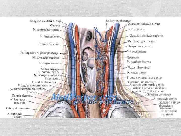 • Кровоснабжение глотки осуществляется из системы наружной и внутренней сонной артерий. Отток венозной крови происходит во внутреннюю яремную вену. • Лимфоотток происходит в глубокие и задние шейные лимфоузлы. • Иннервация обеспечивается нервным сплетением, образованным ветвями языкоглоточного, блуждающего и симпатического нервов. Чувствительная иннервация осуществляется ветвями тройничного нерва.