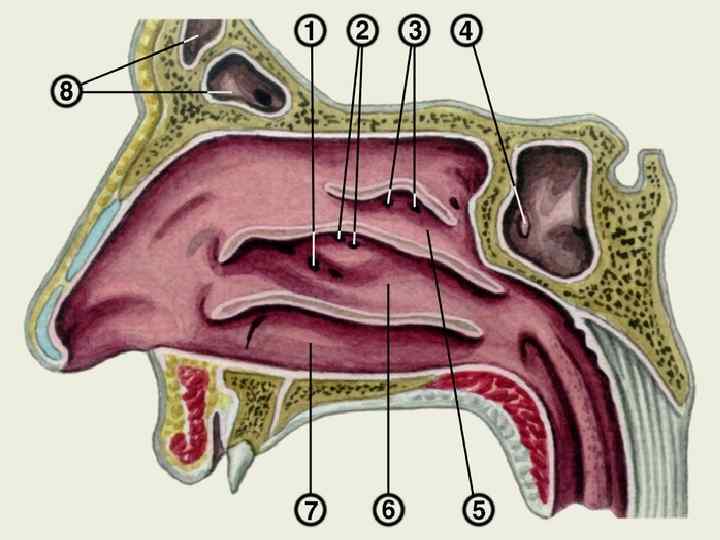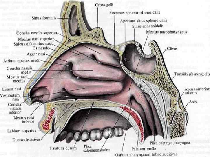 Полость носа - пространство между передней черепной ямкой и полостью рта. Полость носа разделена перегородкой на правую и левую половины и имеет передние отверстия - ноздри и задние - хоаны, ведущие в носоглотку. Каждая половина носа имеет четыре стенки • Медиальная стенка, или перегородка носа • Верхняя стенка • Нижняя стенка, или дно полости носа • Латеральная стенка