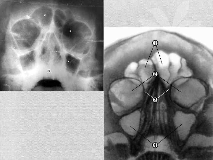 Решетчатый лабиринт расположен между глазницей и полостью носа и состоит из 5 -20 воздухоносных ячеек, каждая из которых имеет свои выводные отверстия в полость носа. Различают три группы ячеек: передние и средние, открывающиеся в средний носовой ход, и задние, открывающиеся в верхний носовой ход. Клиновидная, или основная, пазуха расположена в теле клиновидной кости, разделена перегородкой на две половины, имеющие самостоятельный выход в область верхнего носового хода. Вблизи клиновидной пазухи расположены кавернозный синус, сонная артерия, перекрест зрительных нервов, гипофиз. Вследствие этого воспалительный процесс клиновидной пазухи представляет серьезную опасность.