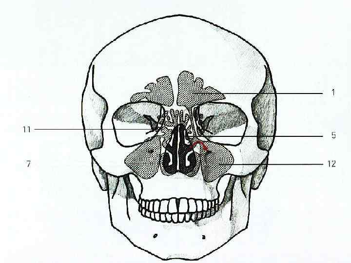 Лобная пазуха находится в толще лобной кости и имеет четыре стенки: • нижнюю глазничную - самую тонкую, • переднюю - самую толстую до 5 -8 мм, • заднюю, отделяющую пазуху от передней черепной ямки, и • внутреннюю - перегородку. Лобная пазуха сообщается с полостью носа при помощи тонкого извилистого канала, который открывается в передний отдел среднего носового хода. Величина пазухи колеблется от 3 до 5 см 3, а в 10 -15% случаев она может отсутствовать.