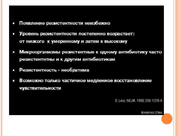 ЛЕКАРСТВЕННЫЕ ВЗАИМОДЕЙСТВИЯ Нельзя смешивать в одном шприце или одной инфузионной системе с лактамными антибиотиками или гепарином вследствие физикохимической несовместимости. § Усиление токсических эффектов при одновременном назначении двух аминогликозидов или при их сочетании с другими нефро- и ототоксичными препаратами: полимиксином В, амфотерицином В, этакриновой кислотой, фуросемидом, ванкомицином. §Усиление нервно-мышечной блокады при одновременном применении средств для ингаляционного наркоза, опиоидных анальгетиков, магния сульфата и переливании больших количеств крови с цитратными консервантами. § §Индометацин, фенилбутазон и другие НПВП, нарушающие почечный кровоток, замедляют скорость выведения аминогликозидов.