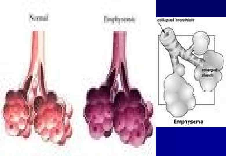 Механизмы развития ХОБЛ Цитокины и хемотактические факторы (TNF , IL-8, LTB 4, etc) вредные частицы или газы (Сигаретный дым) Нейтрофил Альвеолярный макрофаг Сенсорный нерв Нейтрофильная эластаза И другие протеолитические ферменты Бронхиальная гиперсекреция (хронический бронхит) Легкие Деструкция альвеол (эмфизема) -– 1 -антитрипсин