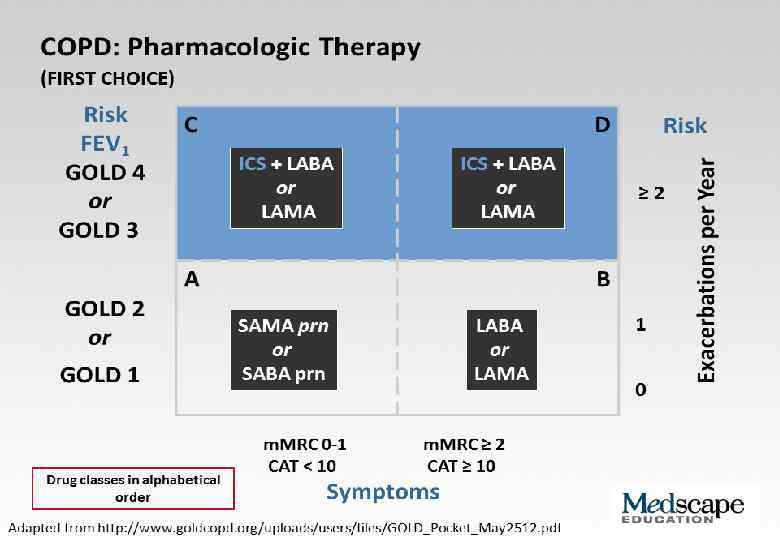 ХОБЛ - основные подходы в лечении n Немедикаментозное лечение – -снижение факторов риска (курение, раздражающие) (А) - О 2 - терапия (А) реабилитационные программы (диета, физ. упр. - А) n Фармакотерапия – – – n - бронхолитики (А) - ГКС (ИГКС ± β 2 - агонист или М-х-литик) (А) - вакцины (гриппозная- А, пневмококковая -В) - муколитические средства Хирургическое лечение – (буллэктомия, трансплантация легкого)