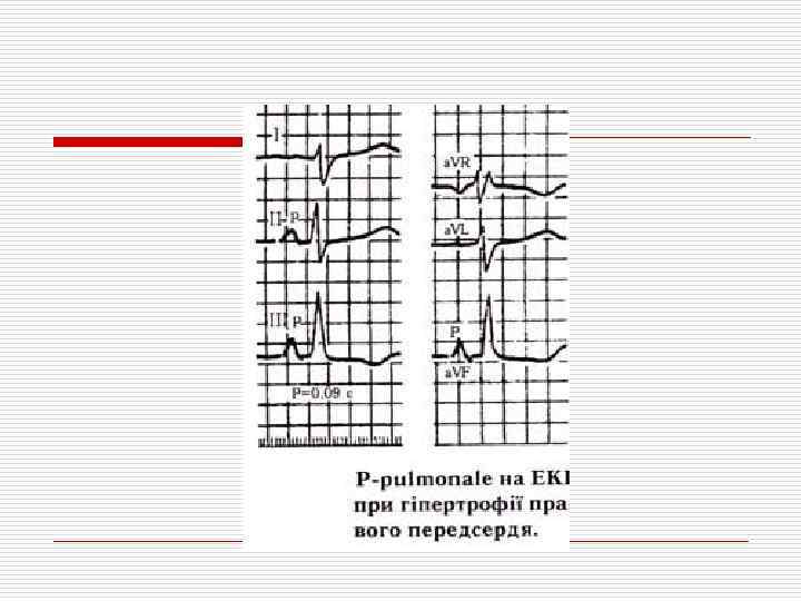 ЭКГ признаки гипертрофии правого предсердия o o Зубец Р высокий (> 2, 5 мм), заостренный (II, III, a. VF) Зубец Р заостренный (P. pulmonale) в V 1 -2 В отведениях I, a. VL, V 5 -6 зубец Р низкий, а в a. VL отрицательный Длительность зубца Р не превышает 0, 10 сек.