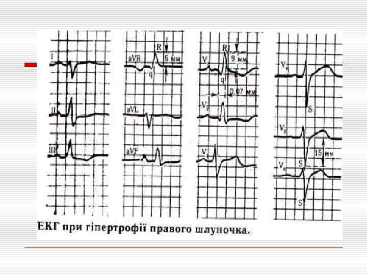 ЭКГ признаки гипертрофии правого желудочка o o Смещение электрической оси сердца вправо (угол > 1000) Увеличение амплитуды R V 1, 2 и амплитуды S(V 5, 6), RV 1 > 7 мм или RV 1+SV 5, 6 > 10, 5 мм Смещение переходной зоны влево (V 5, 6) Смещение сегмента ST вниз и отрицательный зубец Т (III, a. VF, V 1, 2)