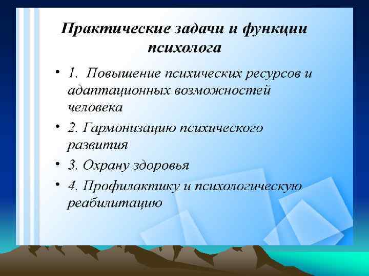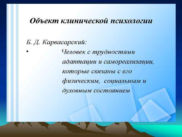 Определение, структура и задачи клинической психологии Клиническая психология есть область профессиональной деятельности, направленной на повышение психических ресурсов человека и его адаптационных возможностей, гармонизацию психического развития, охрану здоровья, преодоление недугов и психологическую реабилитацию.