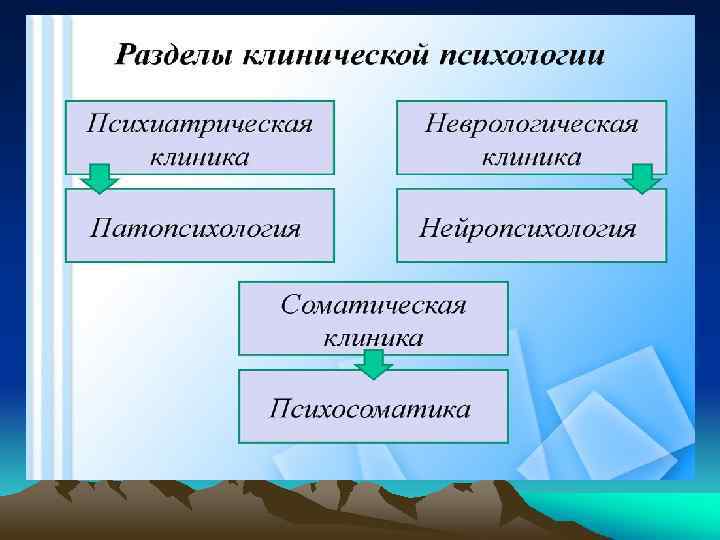 Структура клинической психологии (ее разделы): q нейропсихология q патопсихология q психосоматика q психология аномального развития (дизонтогенез психики) q психокоррекция и психотерапия
