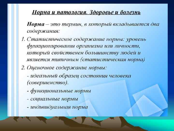 Теории этиологии болезней – – – – Монокаузализм Кондиционализм Конституционализм Генетический детерминизм Болезни цивилизации Теория социальной дезадаптации Психосоматическое направление в медицине