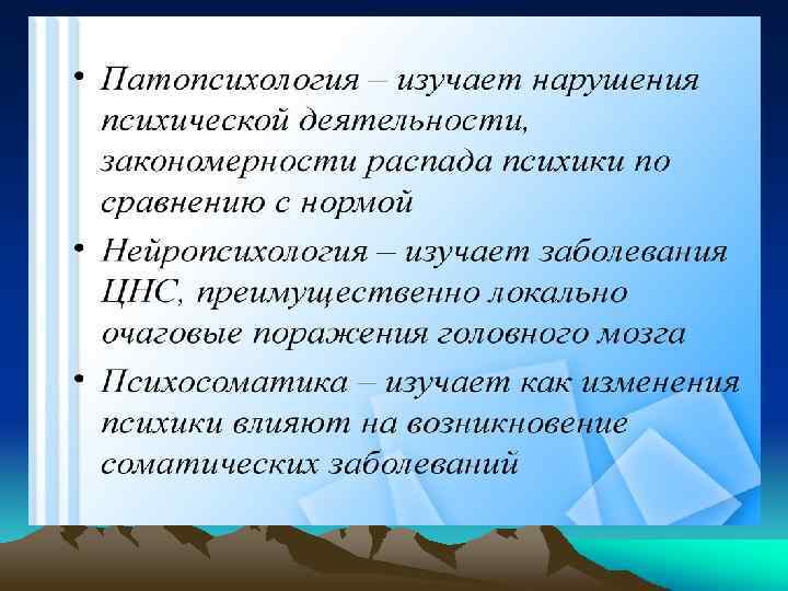 II. Патопсихология (от греч. — страдание, болезнь) — отрасль психологии, изучающая болезненные изменения психики. Изучая закономерности изменения и распада психики, патопсихология сопоставляет их с закономерностями протекания нормальной психической деятельности. Предмет патопсихологии — разработка вопросов аномального психического развития, исследование дефектов отдельных психических функций, а также инволюционных и деструктивных психических состояний.