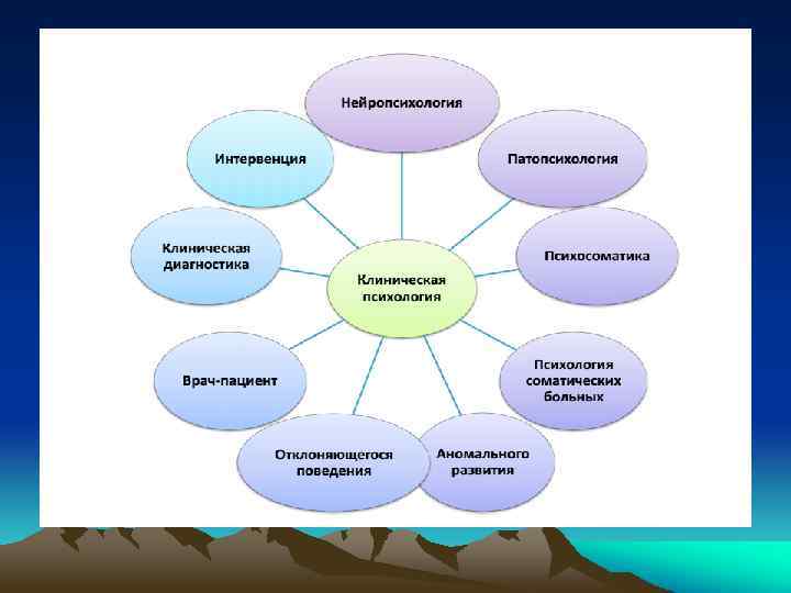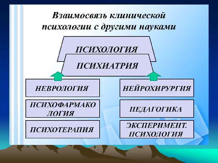 Связь клинической психологии с другими дисциплинами Социальная психология Общая психология Психотерапия Клиническа я психология Психодиагностика Психология личности Возрастная психология Психиатрия