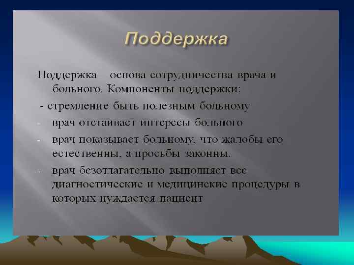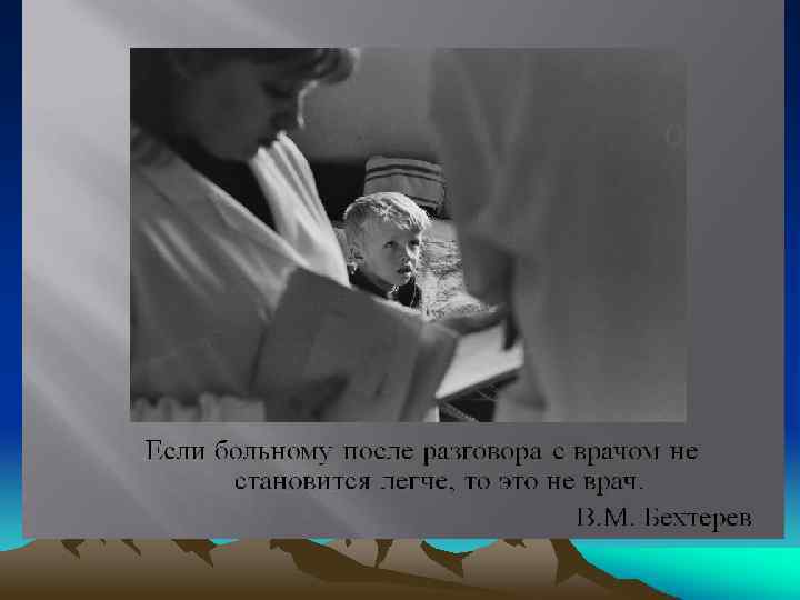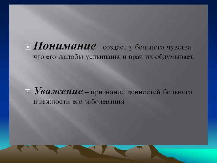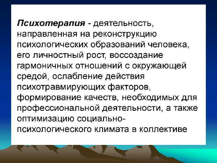 q q Частную психотерапию составляют разнообразные методы воздействия на больного с целью улучшения его психического состояния, выздоровления. Общая психотерапия включает в себя общие принципы деонтологии и медицинской этики.