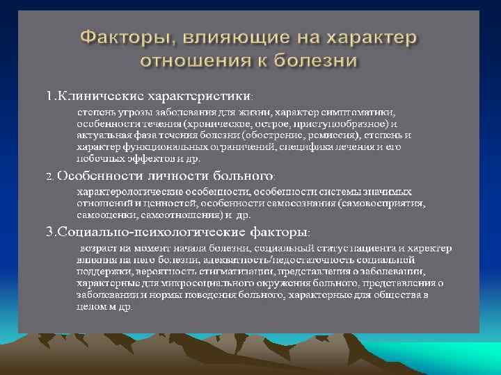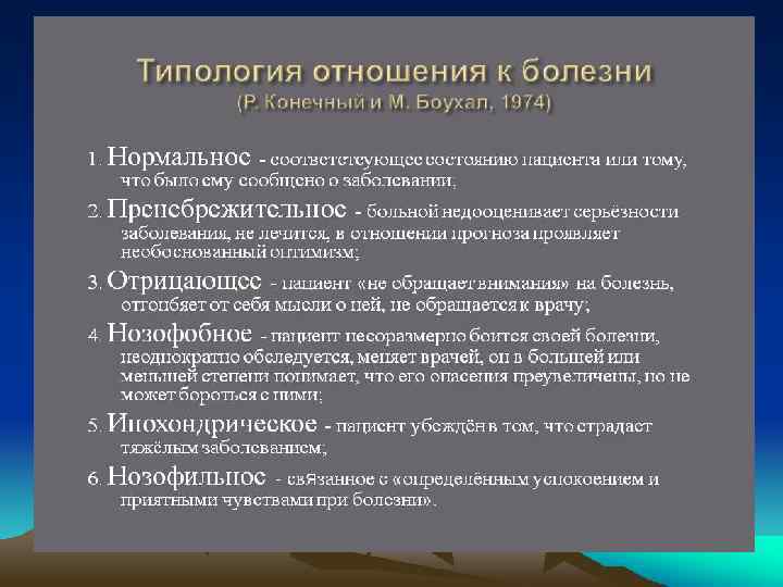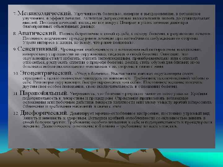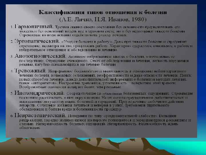 Варианты проявления психосоматического заболевания • • 3. Органические психосоматические болезни (психосоматозы)— в их основе лежит первично телесная реакция на конфликтное переживание, связанная с морфологически устанавливаемыми патологическими изменениями в органах. 4. Психосоматические расстройства, связанные с особенностями эмоционально личностного реагирования и поведения — склонность к травмам и другим видам саморазрушающего поведения (алкоголизм, наркомания, табакокурение, переедание с ожирением и другие).